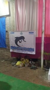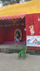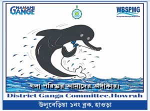 As part of the district-wide programme guided by the District Ganga Committee, Howrah, and the West Bengal State Programme Management Group (WBSPMG) under the Namami Gange Mission, attractive flex banners (6 ft x 4 ft) were displayed at local Puja pandals and strategic public locations across the block. The visuals carried messages urging people to “Stop Polluting Rivers, Maintain Ecological Balance” and featured the symbolic Ganga Dolphin, representing purity and biodiversity of the sacred river.